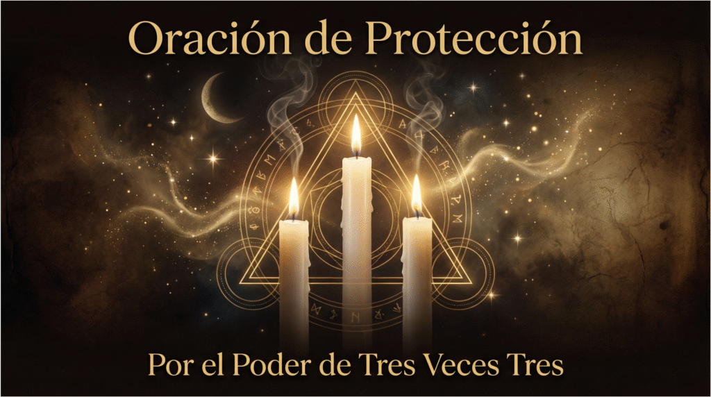 Descubre la poderosa Oración del Poder de Tres Veces Tres. Aprende el ritual completo de protección, paso a paso, para devolver energías negativas y crear un escudo espiritual. Guía práctica con Hechizos y Magia.